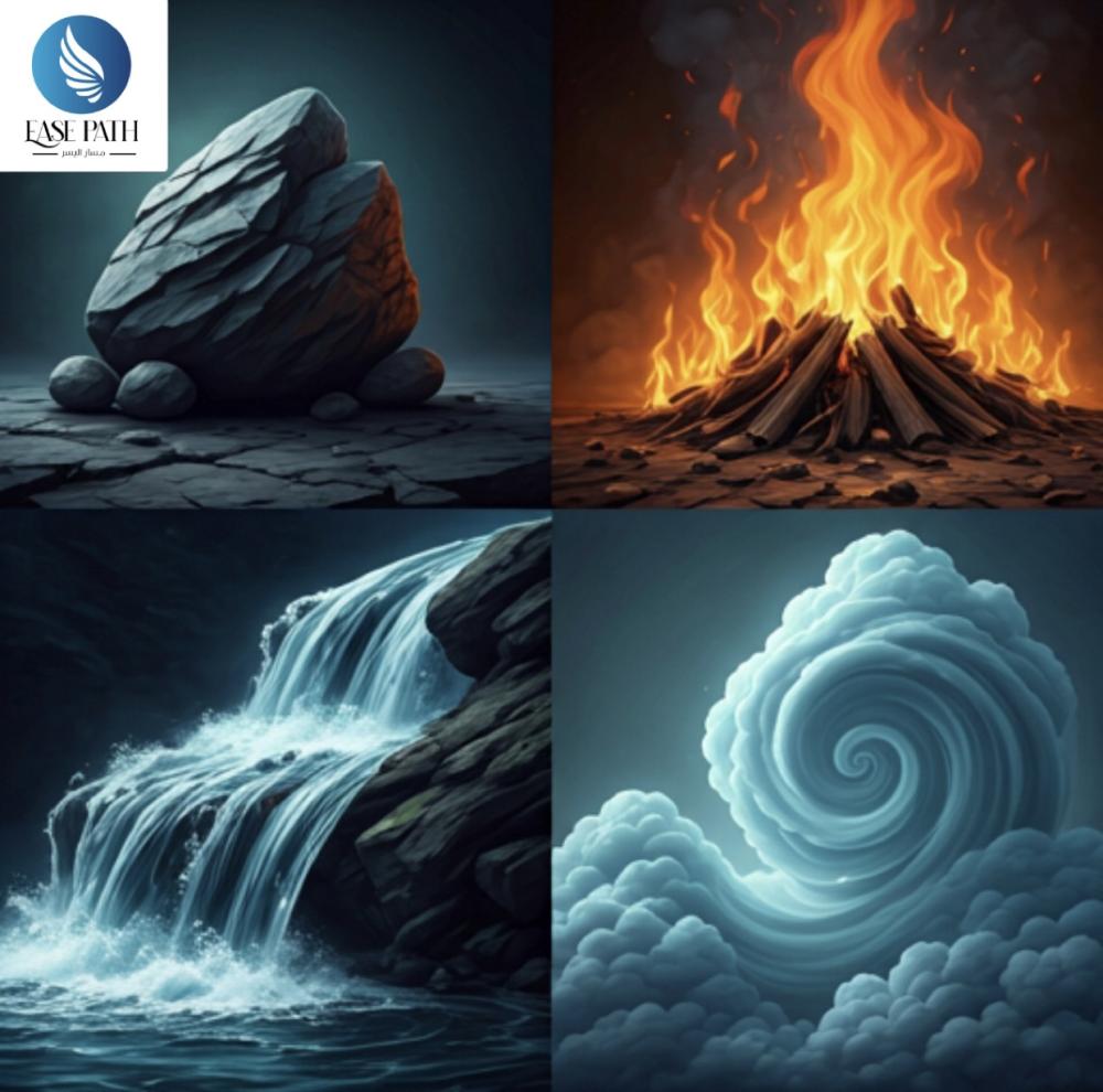الماء 💦 ، النار 🔥، الهواء 💨، والتراب 🏖️.